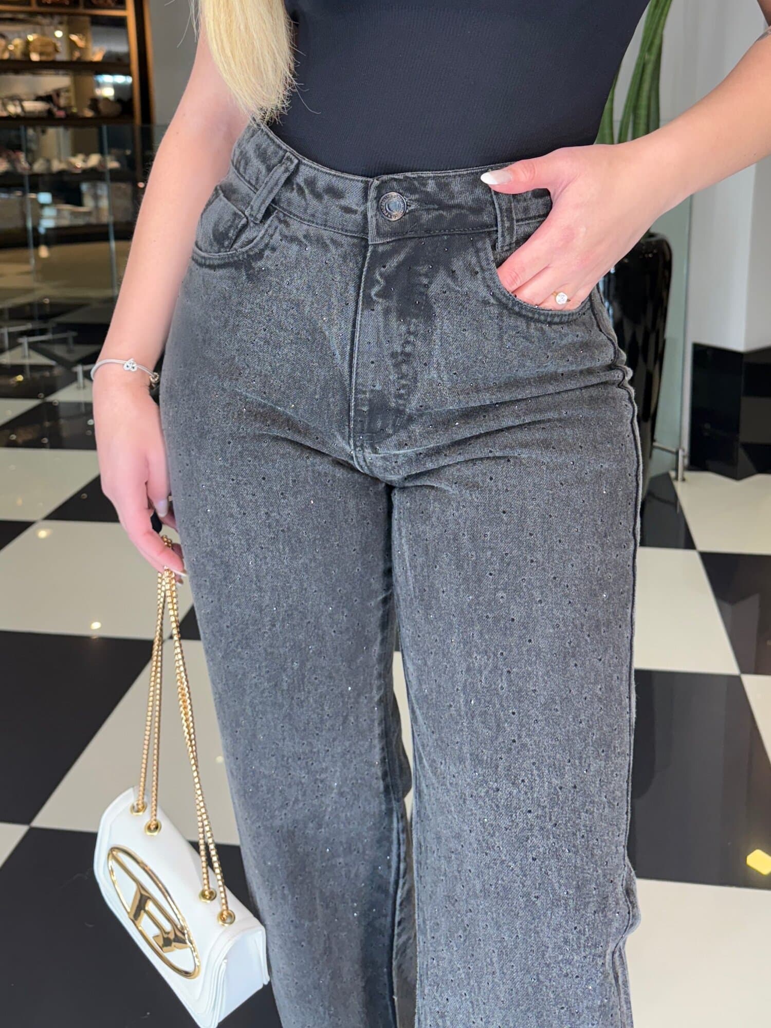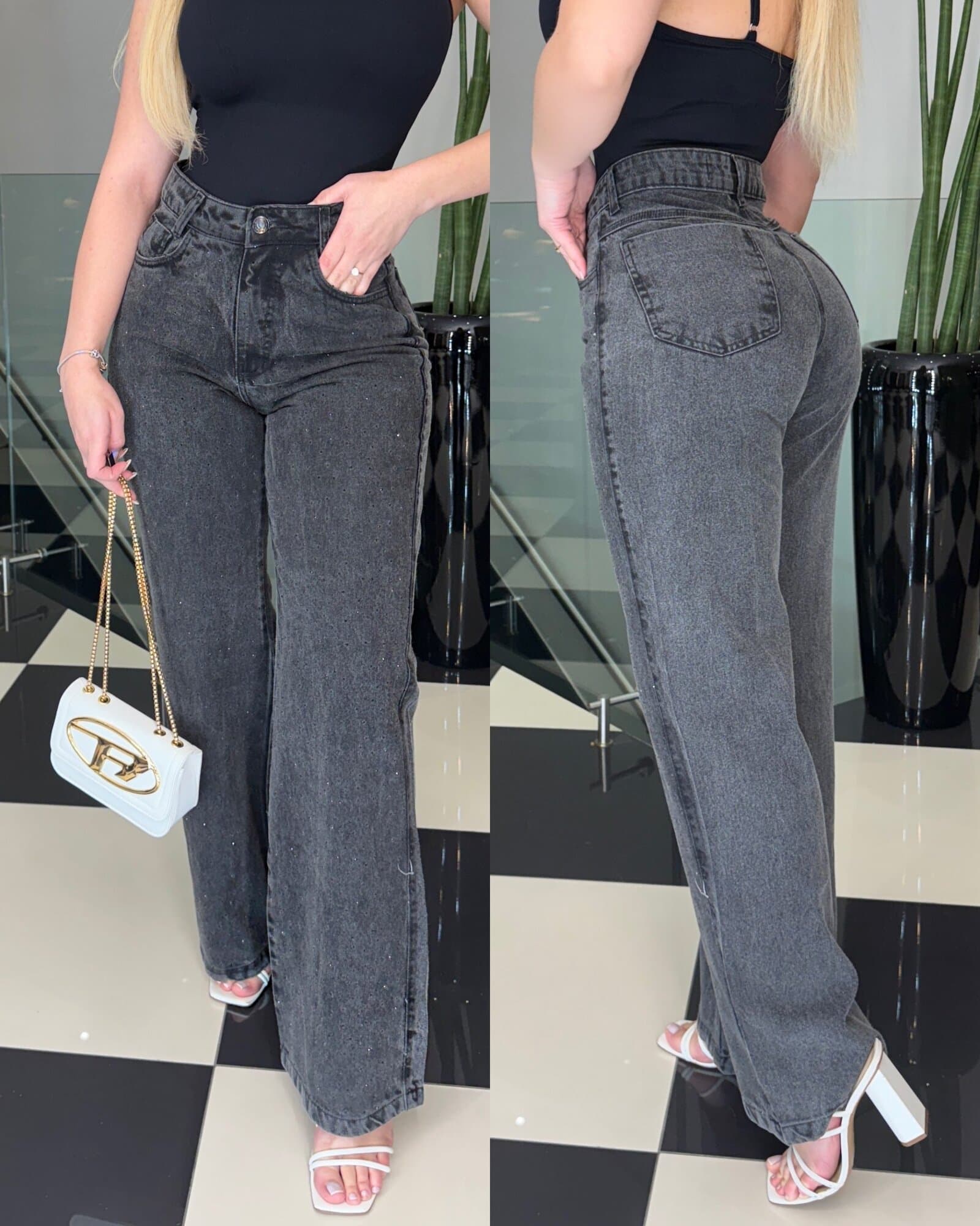 Calça Jeans Preta com Strass Wide Leg Anouk