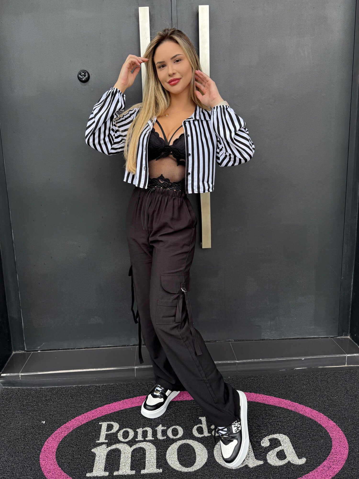 Medidas da modelo: Altura 1,70; Peso 62kg; Cintura 65cm; Busto 96cm; Quadril 101cm;