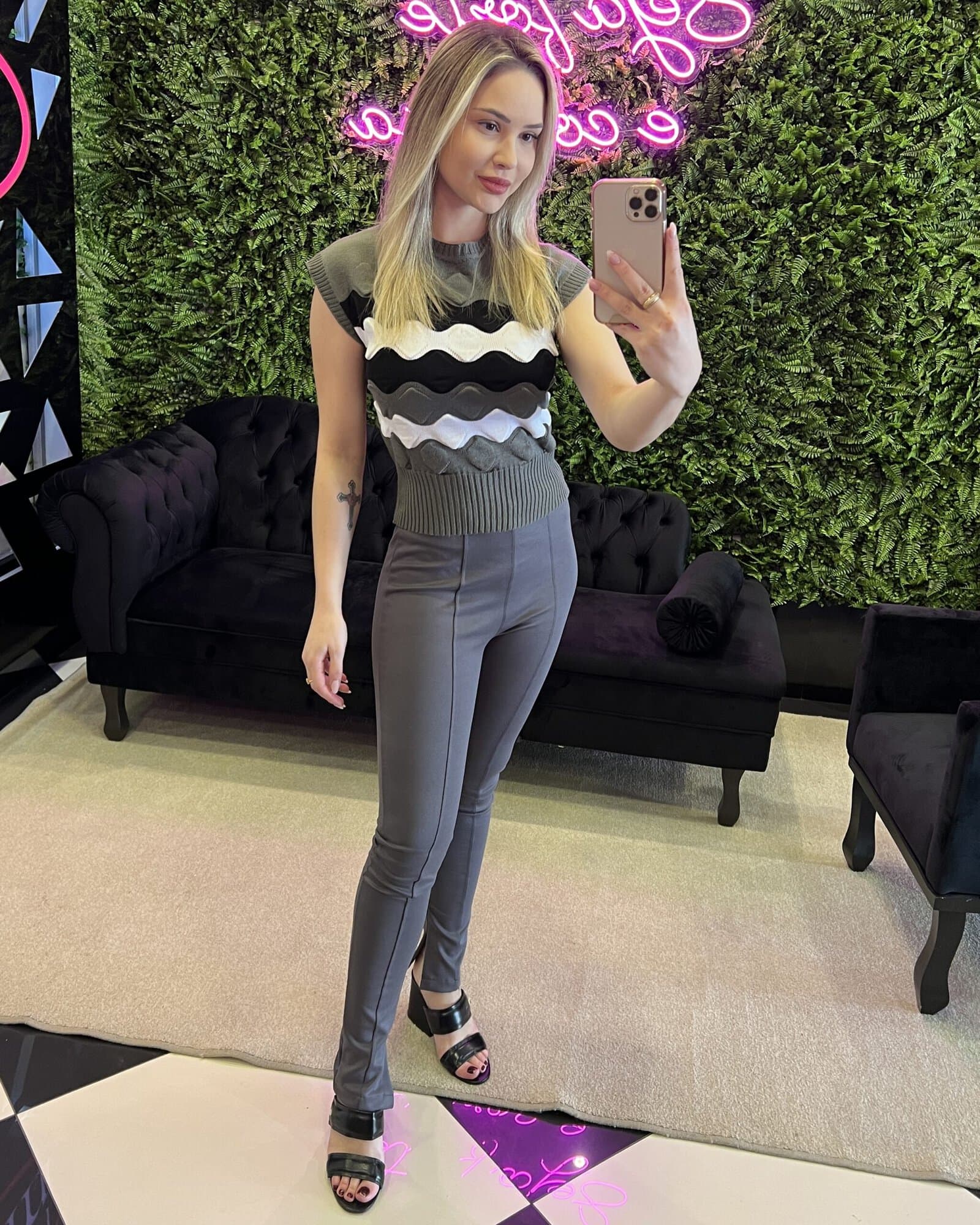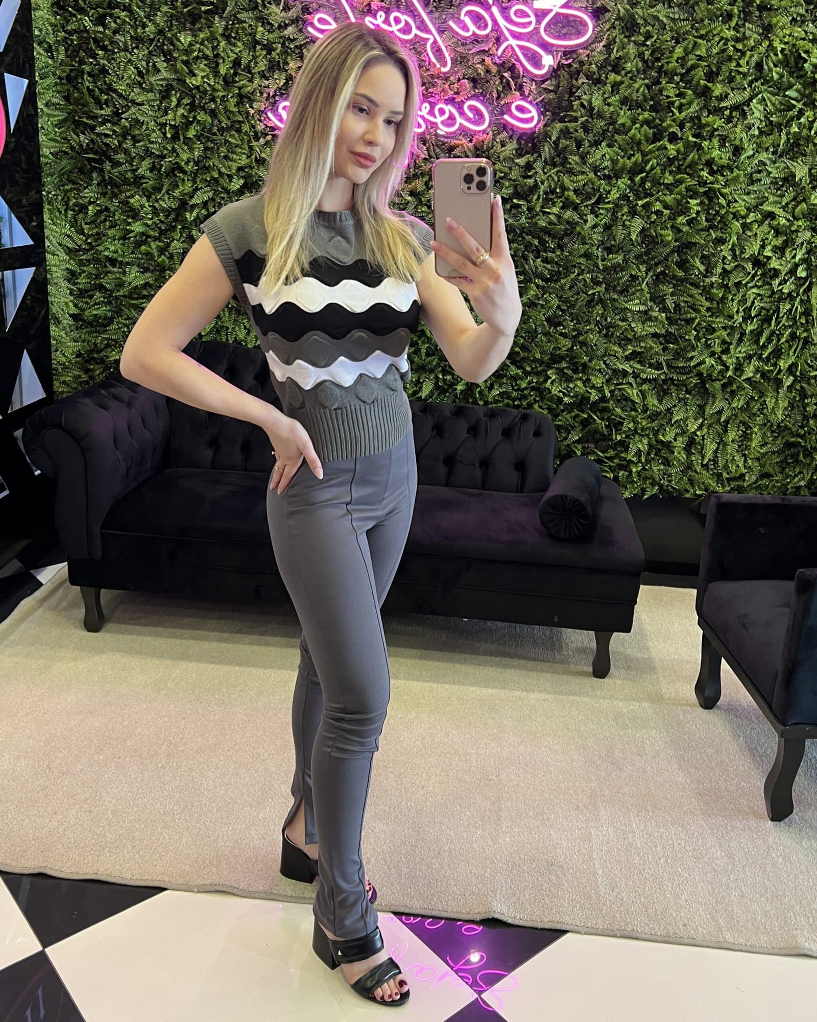 - calça em ponto roma com elastano, a modelagem é skinny, cós alto, detalhe de abertura na parte interna do tornozelo;