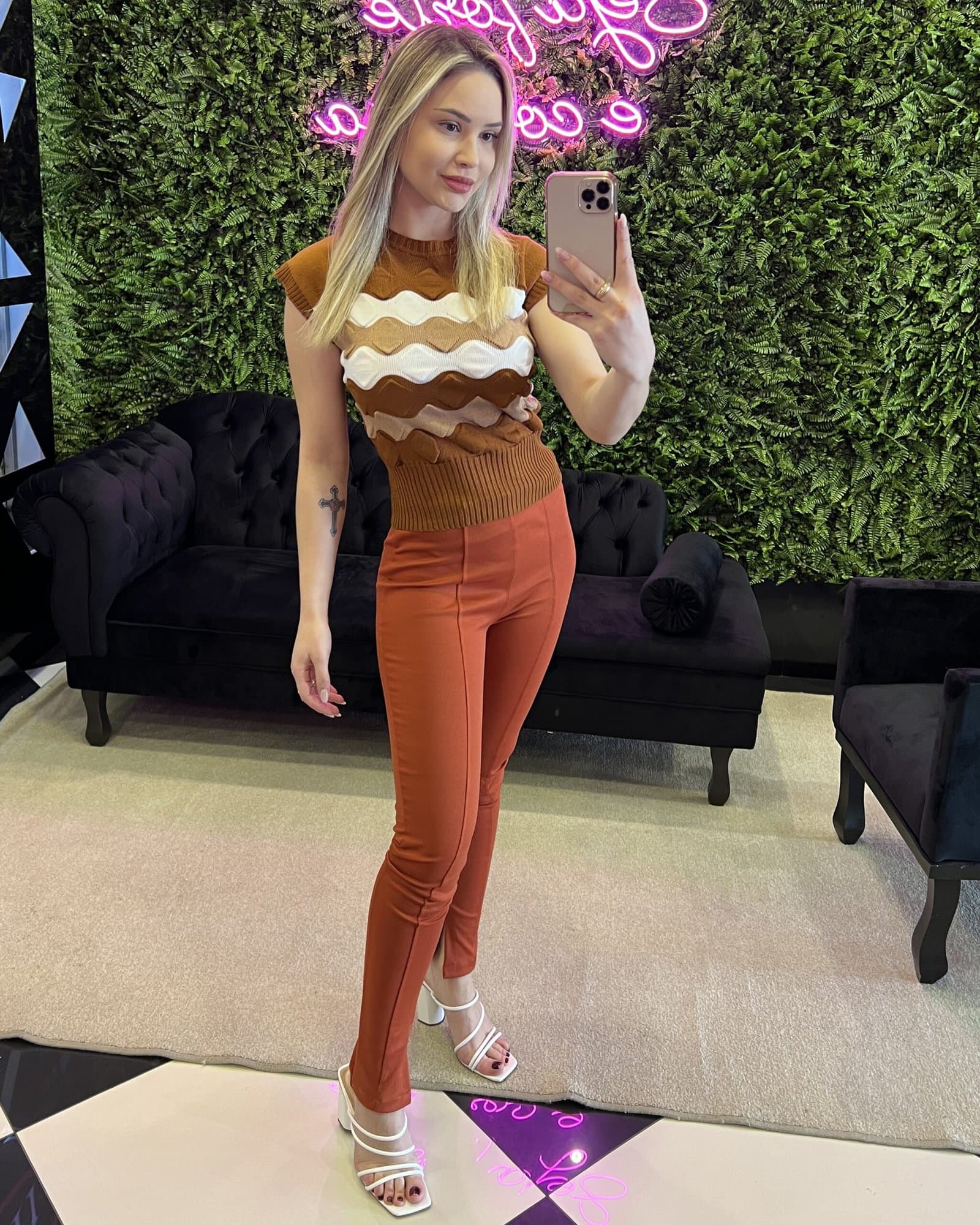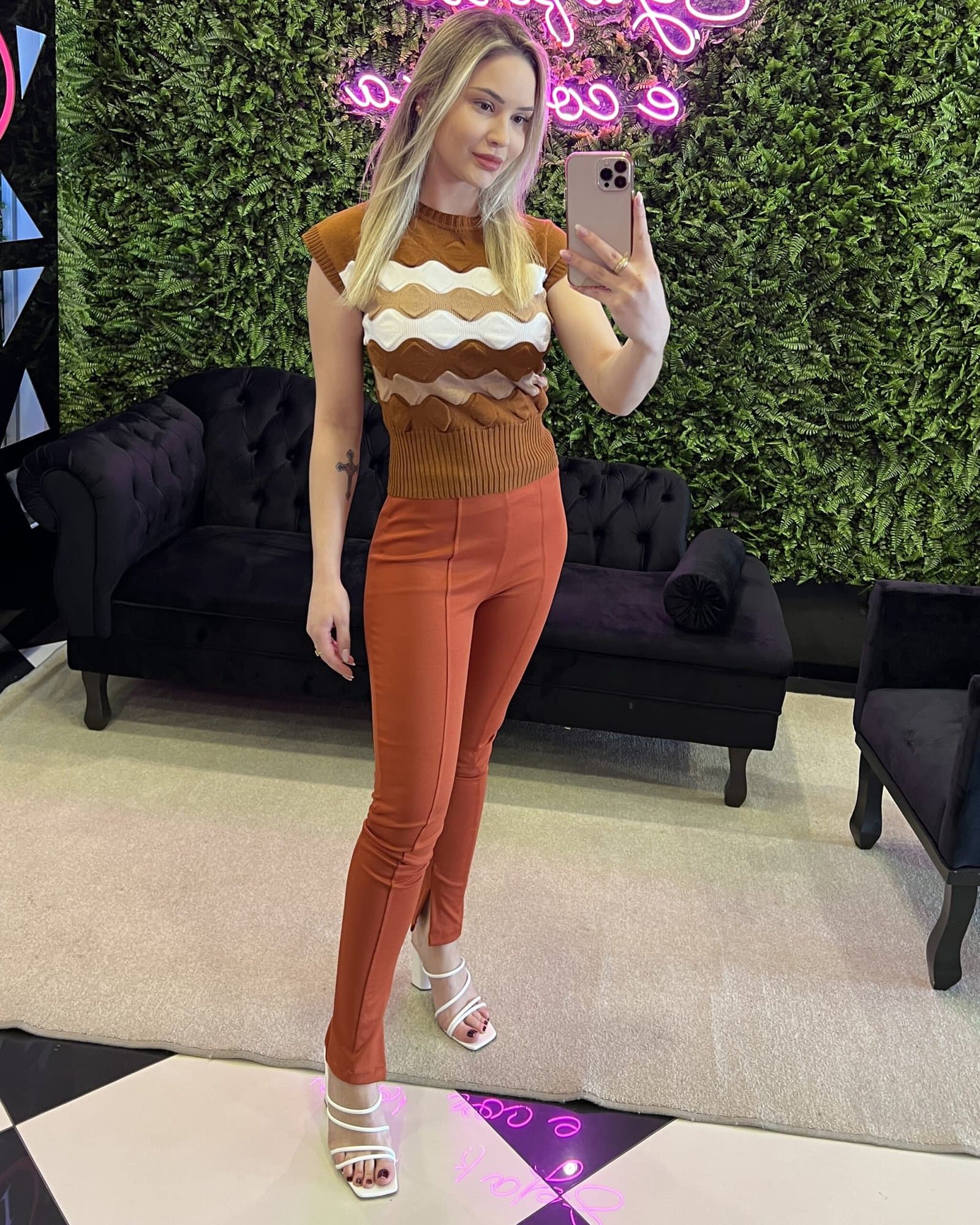 - calça em ponto roma com elastano, a modelagem é skinny, cós alto, detalhe de abertura na parte interna do tornozelo;