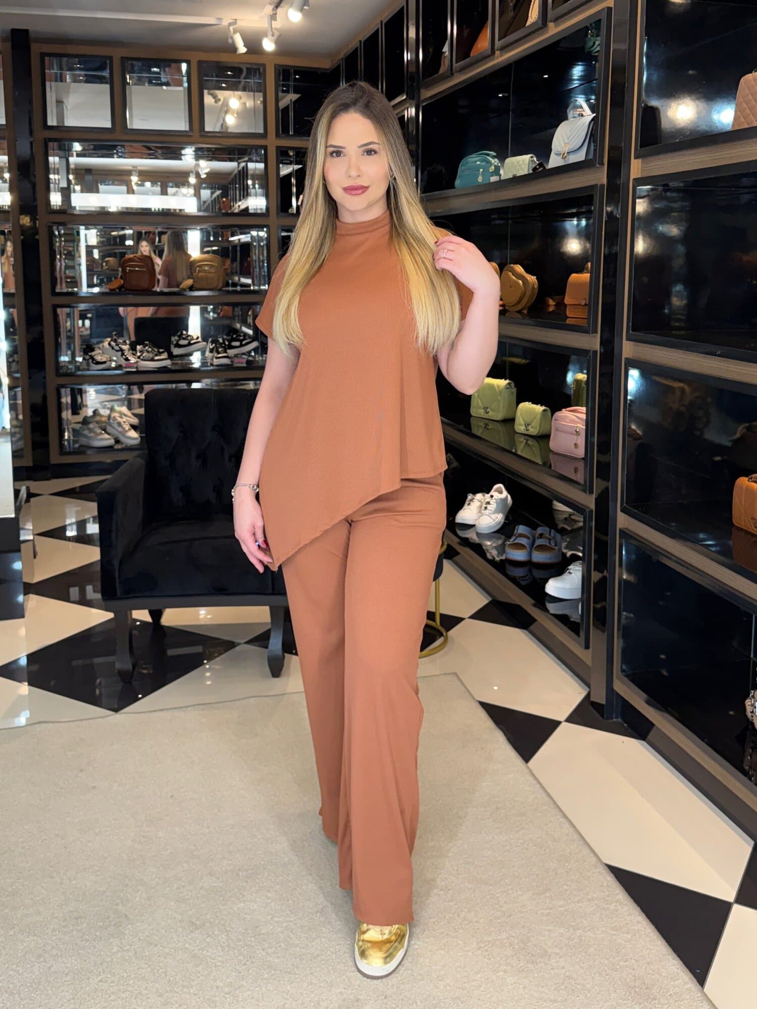 - calça modelo pantalona com bolsos;