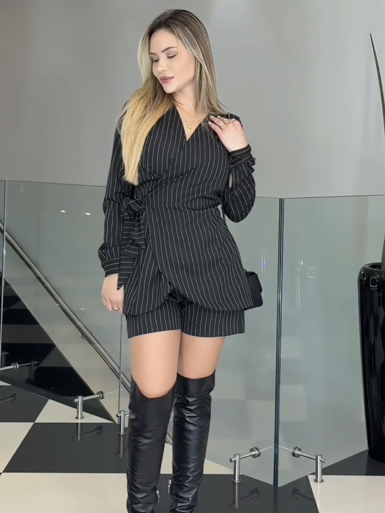 - composto por shorts com elástico nas costas e blazer com fechamento por amarração (ajustavel);