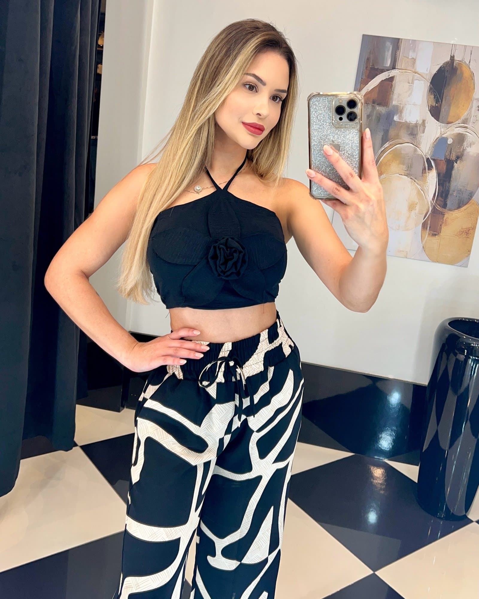 Medidas da modelo: Altura 1,70; Peso 62kg; Cintura 65cm; Busto 96cm; Quadril 101cm;