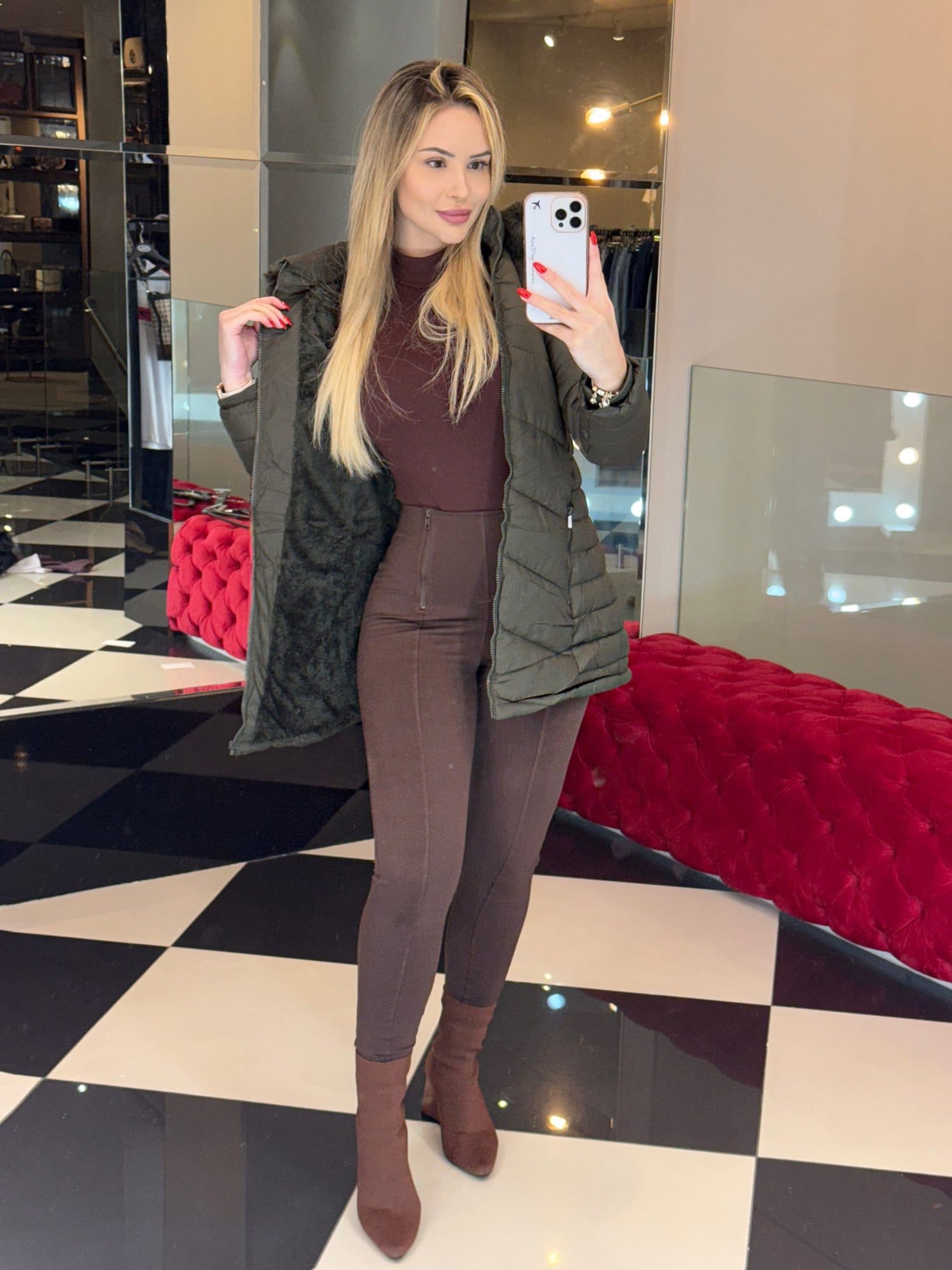 Medidas da modelo: Altura 1,70; Peso 62kg; Cintura 65cm; Busto 96cm; Quadril 101cm;