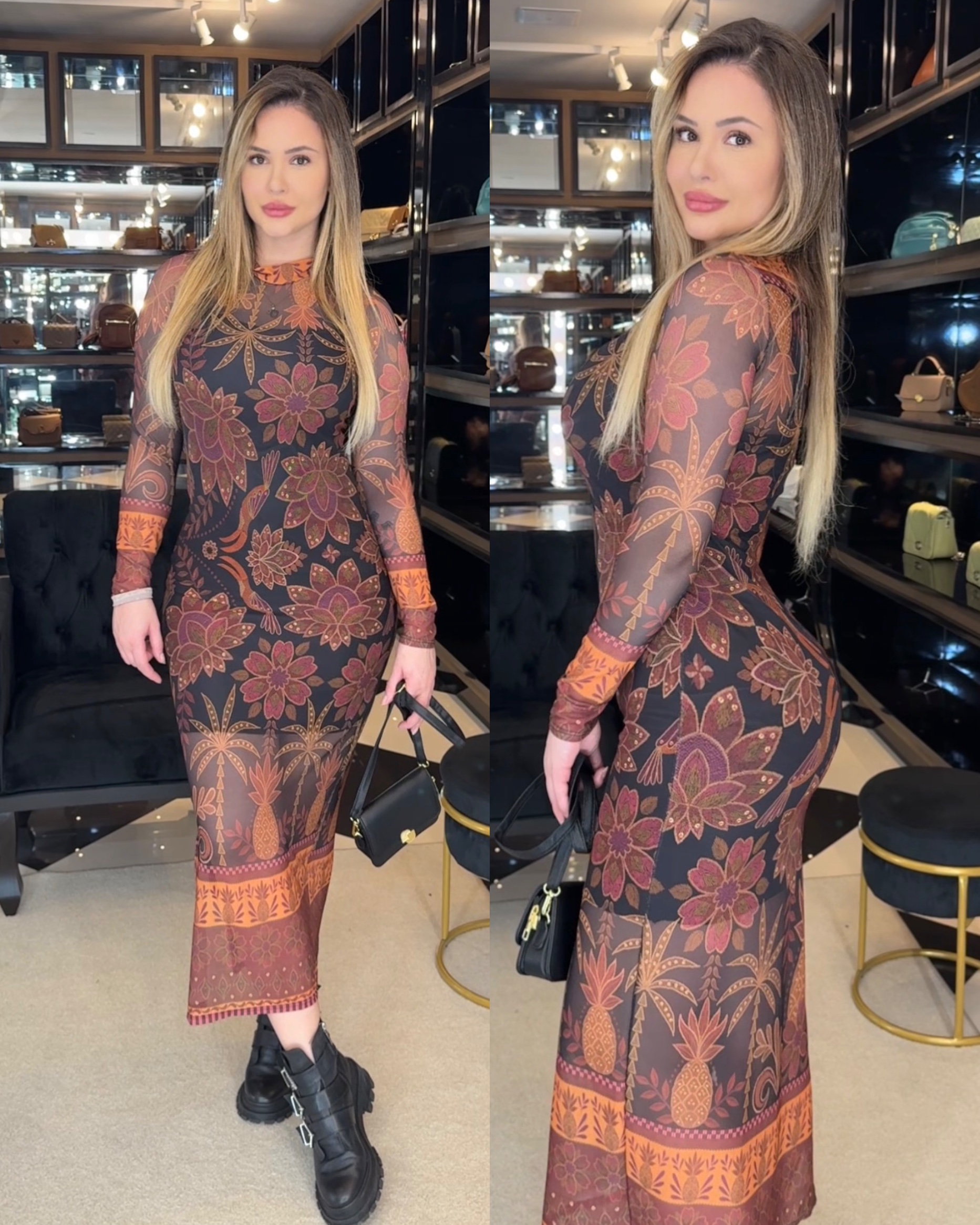 Medidas da modelo: Altura 1,70; Peso 62kg; Cintura 65cm; Busto 96cm; Quadril 101cm;