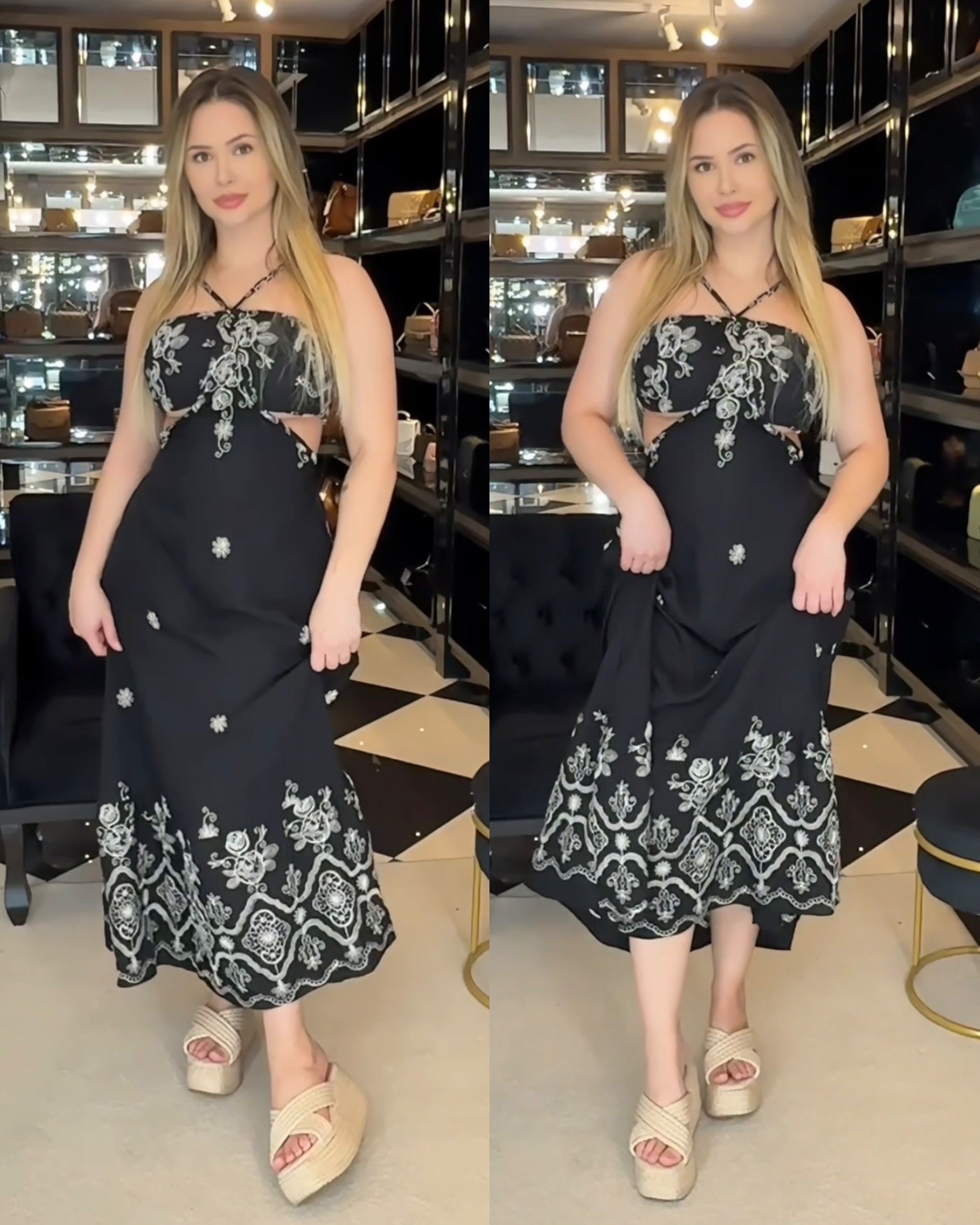 Medidas da modelo: Altura 1,70; Peso 62kg; Cintura 65cm; Busto 96cm; Quadril 101cm;
