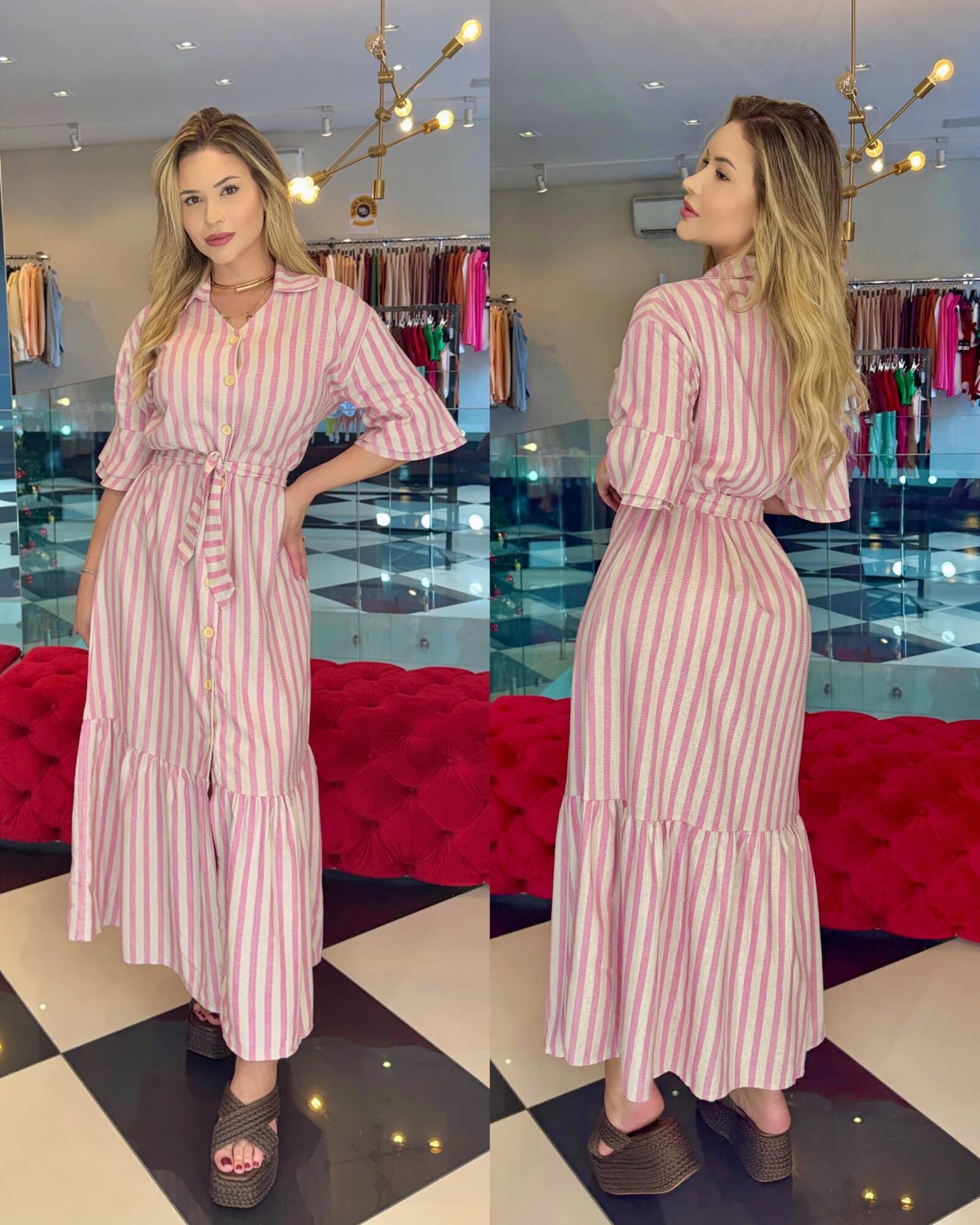 Medidas da modelo: Altura 1,70; Peso 62kg; Cintura 65cm; Busto 96cm; Quadril 101cm;
